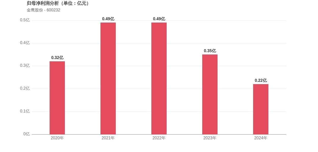 利润角度分析,2020年金鹰股份实现归母净利润0.32亿元,2024年0.22亿元。近年来公司盈利水平呈现下滑趋势,2023年和2024年连续两年出现负增长。