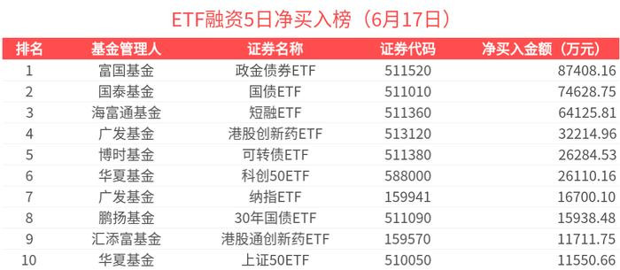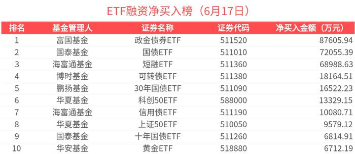 2025年6月17日股票配资相关网址,共217只ETF基金获融资净买入,25只ETF基金融券净卖出。融资净买入金额超500万元的有55只,政金债券ETF(511520.SH)、国债ETF(511010.SH)、短融ETF(511360.SH)、可转债ETF(511380.SH)、30年国债ETF(511090.SH)杠杆资金显著流入,分别净流入8.76亿元、7.21亿元、6.90亿元、1.82亿元、1.65亿元。