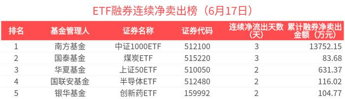 近期获杠杆资金连续融券净卖出的ETF基金有12只,居前的为中证1000ETF(3天)、煤炭ETF(3天)、上证50ETF(2天)、半导体ETF(2天)、创新药ETF(2天)等,分别净卖出1.38亿元、83.68万元、631.37万元、116.02万元、104.77万元。其中,上证50ETF近2天获杠杆资金加速流出,近2天杠杆资金累计流出631.37万元。